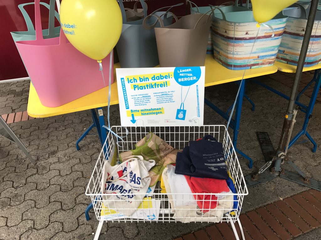 Ich bin dabei: Plastikfrei! Auf der gesamten Berger Straße stehen von unten bis oben verteilt bekanntlich 10 Taschenstationen zum hinein Legen oder Entnehmen von Einkaufstaschen – frei zum Gebrauch für Alle.
