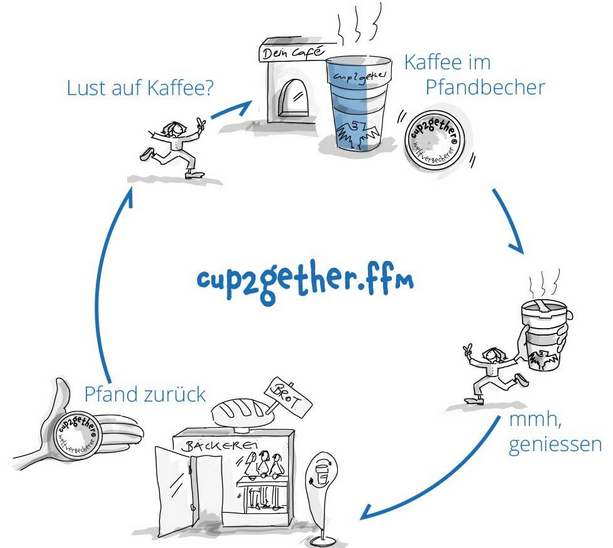 Mittlerweile machen rund 40 Cafés, Kioske & Co. in und um die beliebte Berger Straße in den Frankfurter Stadtteilen Bornheim und Nordend mit. Dort können (derzeit über 700) Kundinnen und Kunden Kaffee und andere Heißgetränke in Mehrwegbechern kaufen. Das Besondere dabei: Den Pfandbecher können sie danach nicht nur in einem Café abgeben, sondern bei allen Cafés, die beim Versuch mitmachen. Es gibt kein Geldpfand, sondern einen Tauschcoin, eigentlich ist es eher ein Tauschsystem à la Sharing Economy.