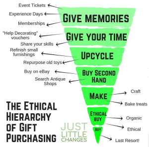 Auch zu Weihnachten: kleine Veränderungen! Die englische Firma Just Little Changes bietet nachhaltige Produkte an, die im Alltag kleine Veränderungen bewirken können. Hier nun ihre ultimativen Tipps zur Methode der Geschenkeauswahl. Das geht von gemeinsamen Veranstaltungsbesuchen, Treffen, bis hinunter zur letzten Möglichkeit Neukauf.