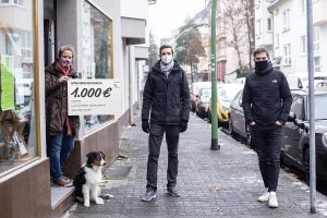 Und was soll ich sagen? Bailey war 2020 für mich wahrscheinlich die nachhaltig wertvollste Entscheidung überhaupt. Es gibt keine Entschuldigungen mehr fürs Stubenhocken. Bailey möchte raus, bei Wind und Wetter. Mehrmals am Tag. Er möchte lernen, er möchte erzogen werden, und wir möchten für ihn da sein. Auf einmal geht all das, was ich vorher für unmöglich gehalten habe: lange Spaziergänge mit den Kindern müssen nicht mehr erzwungen werden, die Koordination von Arbeitsslots, die Spaziergänge zwischendurch ermöglichen, das Absprechen von Kundenterminen, wenn keine Hundebetreuung organisiert werden kann. Bailey war schon bei zig Videokonferenzen dabei, fühlt sich sowohl in unserem Büro als auch in der Naturstein-Werkstatt seines Herrchens wohl und hat die Übergabe des Spendenschecks von New Office bereichert (s. Foto). Ich erlebe aktuell, wie Kinder, Arbeit und Freizeit nicht nur gut unter einen Hut zu bekommen sind, sondern mir in Bezug auf meine seelische, psychische und körperliche Ausgeglichenheit selbst guttun. Das ist für mich ein wichtiger Teil gelebter Nachhaltigkeit geworden und ich freue mich darüber jeden Tag.