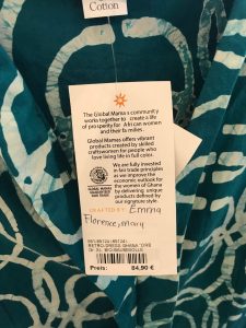 Wenn also ein Weltladen ein Fair Trade Siegel auf ihren Produkten führen, auch ein solches, das wir als Konsument:innen nicht gut kennen, können wir dem Label mehr trauen, weil der Weltladen bekannt dafür ist, sich gut zu informieren? Mein Gefühl sagt mir: ja – was denkt ihr? Ein Label, welches mir besonders imponiert hat, ist „Global Mamas Guaranteed Fair Trade„. Bei diesem Standard wird nicht nur auf faire Arbeitsbedingungen geachtet, sondern den Menschen (vor allem Frauen), die in Handarbeit die Kleider herstellen, wird buchstäblich ein Gesicht gegeben – Meet the Mamas. Auf jedem Kleidungsstück sind die Namen der an der Produktion beteiligten Frauen geschrieben. Keine großen, unabhängigen Zertifizierungsinstanzen, dafür Nähe zur Urproduktion der Kleidung über Geschichten und Gesichter. Mode beim Weltladen Bornheim wird auf ihrer Webseite übrigens unter der Rubrik Kunsthandwerk geführt – da passt es meiner Meinung nach sehr gut hin. 🙂