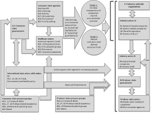 In der Abbildung aus dieser Studie kann man erkennen, wie viele unterschiedliche Akteure an Bedingungen und auch an Veränderungen in der Antibiotika-Produktion beteiligt sind. Für die zwei übergreifenden Ziele – Ziel 1: Die Transparenz der Produktioneketten und Umweltwirkungen erhöhen; Ziel 2: Verschmutzung verringern und Emissionsziele einhalten – ist das Zusammenspiel vieler Akteure notwendig: Akteure des Gesundheitssektors, Verbraucherorganisation, internationale staatliche Akteure mit Einfluss auf Handel-, Umwelt- und Gesundheitsgesetzgebung, NGOs etc.