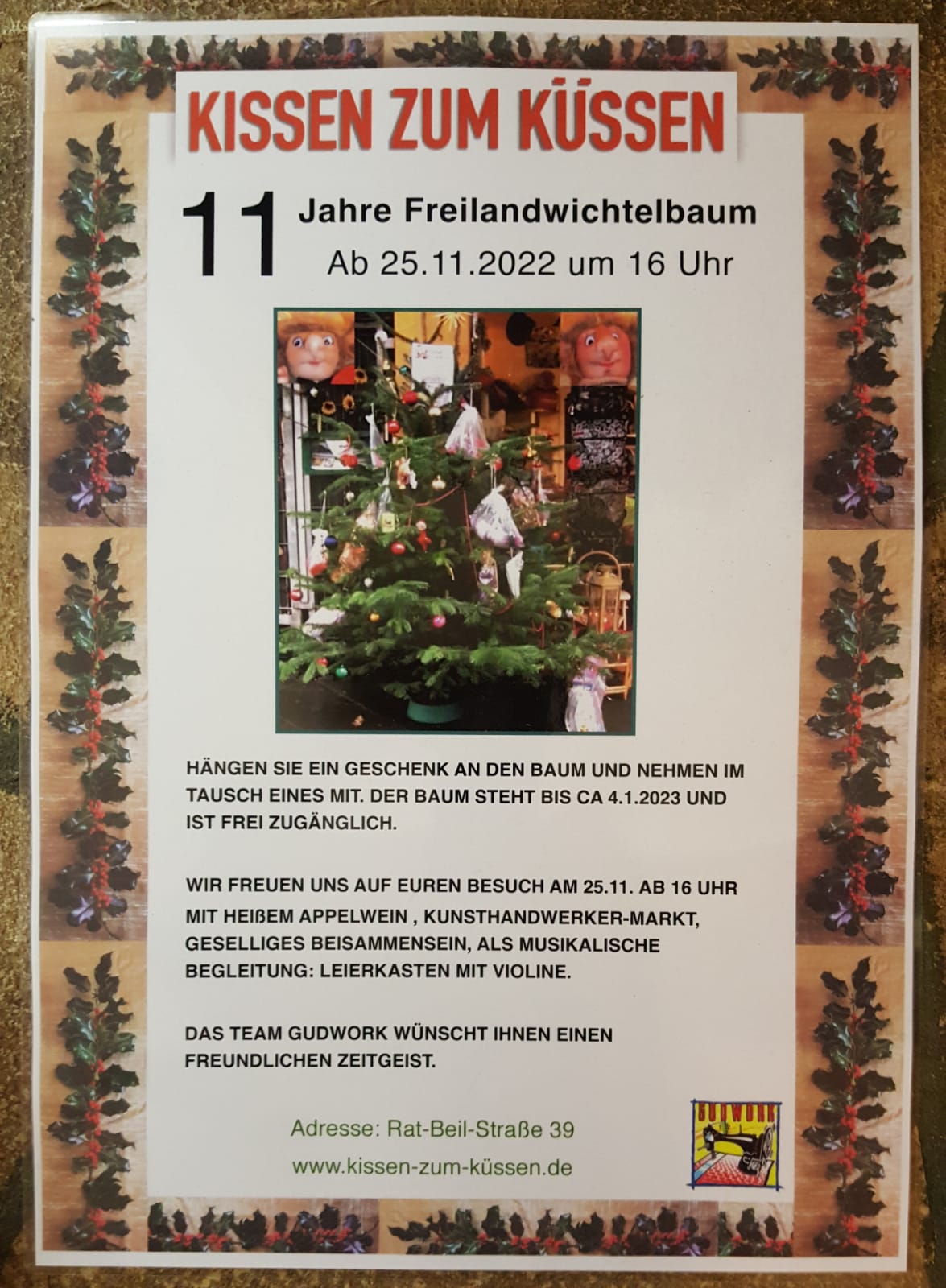 „Wir freuen uns auf euren Besuch am 25.11.2022 ab 16 Uhr mit heißem Appelwein, Kunsthandwerker-Markt, geselliges Beisammensein und als musikalische Begleitung: Leierkasten mit Violine. Das Team von Gudwork wünscht ihnen einen freundlichen Zeitgeist.“