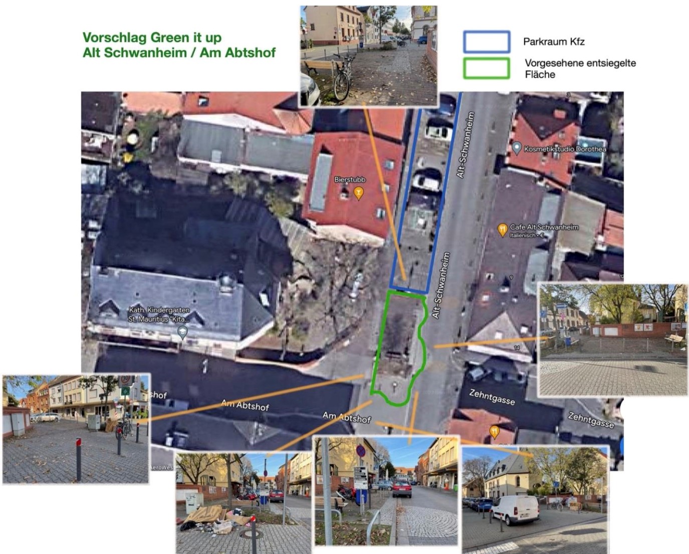 „Durch Entsiegelung wollen wir bestehende Treffpunkte wie z.B. das Stadtteilcafé aufwerten und gleichzeitig nicht-kommerzielle Aufenthaltsräume schaffen. Daneben könnten grüne Inseln im Straßenbild dafür sorgen, dass Autofahrende die bestehenden Spielstraßen mehr beachten bzw. die Durchfahrt ganz vermeiden. Bestehende Akteure wie z.B. die zentral gelegene Kirche / Gemeindezentrum wollen wir dabei einbinden und auch dort entsiegeln bzw. dortige Flächen für Regenwassergewinnung nutzen.“