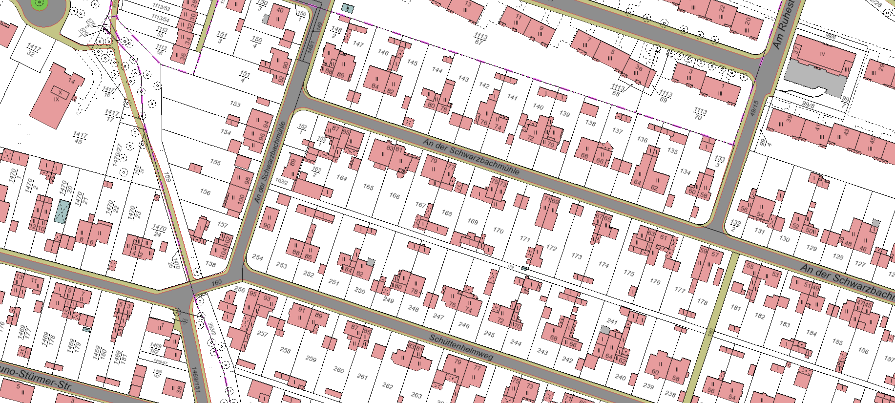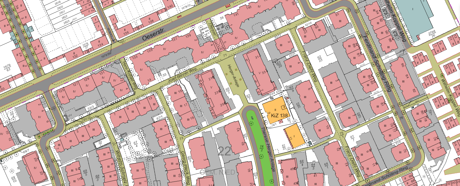 „Im Bereich der Stichstraße zwischen Harthweg und Schüttenhelmweg eine Randbegrünung (s. Karte gelbe Markierung) und/ oder auf der Kreuzung (roter Kreis in der Karte) ein Baum mittig oder an den Straßenrundungen zwei oder drei Pflanzbereiche (ein Teil Straßenraum u. ein Teil Bürgersteigfläche) für je einen Baum und/oder Strauch.“