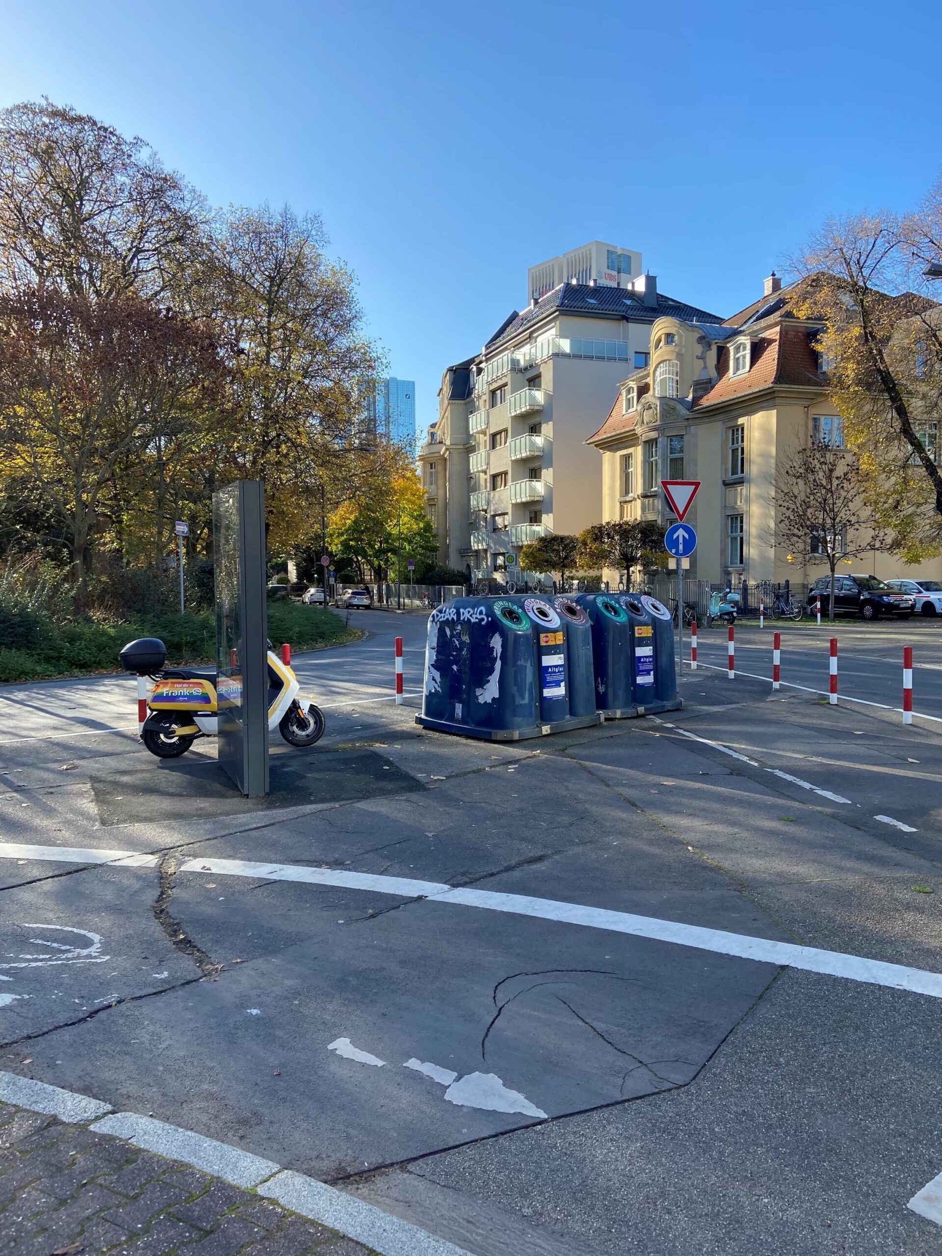 „Direkt neben dem Ziegelhüttenplatz, auf Höhe der Mörfelder Landstr. 125 befindet sich eine große, dreieckige Asphaltfläche. Sie ist abgepollert und völlig ungenutzt (bis auf 2 Glascontainer). Diese wollen wir gerneventsiegeln und bepflanzen. Zum Beispiel mit einem Mini-Wald (Miyawaki-Wald), zumindest aber mit dicht wachsenden insektenfreundlichen Sträuchern.“