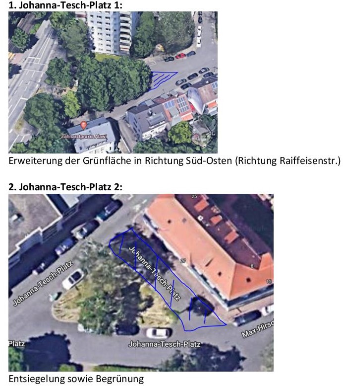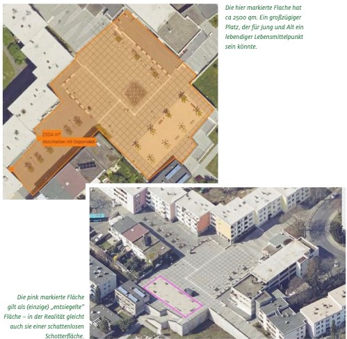 „Am liebsten würden wir den ganzen Platz entsiegeln. Aber vielleicht reicht es auch schon durch Teilentsiegelung ein paar grüne Inseln auf dem Platz zu schaffen -am besten in Verbindung mit Sitzgelegenheiten.“