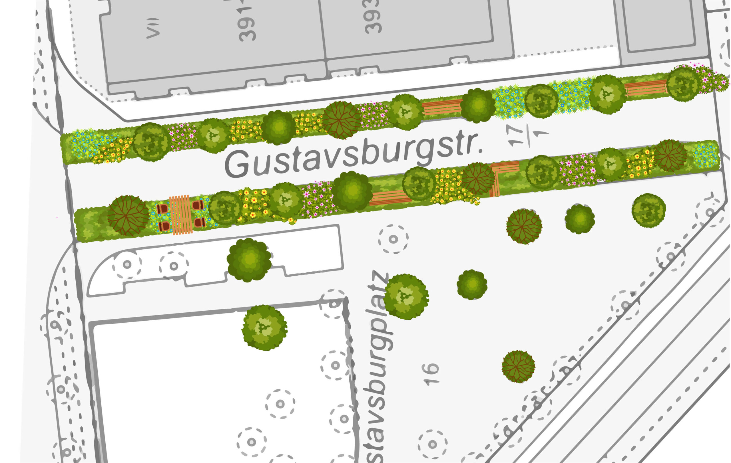 „Die Gustavsburgstraße ist seit langer Zeit still gelegt und für den Autoverkehr gesperrt. Da die Straße gesperrt ist sind auch die PKW-Stellflächen zwischen den Baumscheiben ungenutzt und wären für eine Entsiegelung geeignet. Wir stellen uns vor, dass die stillgelegte Straße und der angrenzende Gustavsburgpark durch die Entsiegelung einiger Parkplätze und die Bepflanzung mit Stauden oder Insektenblühern eine Aufwertung erfahren würde.“