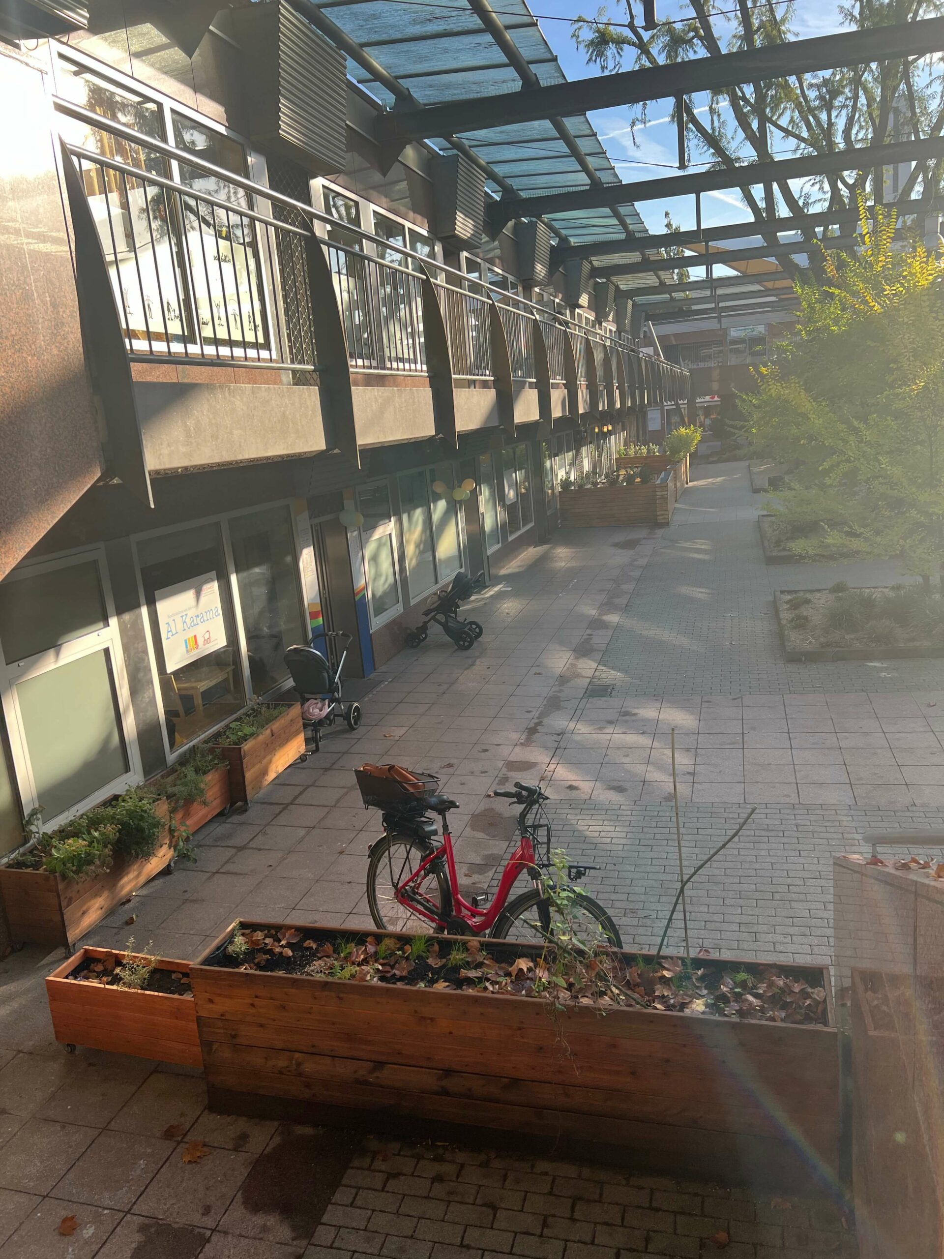 „Unser KiFaZ befindet sich in einem kleinen Einkaufszentrum, wo der Durchgangsweg der Stadt gehört. Der Durchgang soll schöner, begrünter und mit Sitzgelegenheiten zum Verweilen einladen. In dem kleinen Zentrum befindet sich unser KiFaZ mit Kita, Schülerladen und Familienbildung. Hier gibt es einige Einkaufsmöglichkeiten, Jugendclub und Jugendbüro und einige Restaurants. Hier gehen tagtäglich viele Menschen ein und aus, Familien mit Kindern und Senioren internationaler Herkunft und Kultur.“