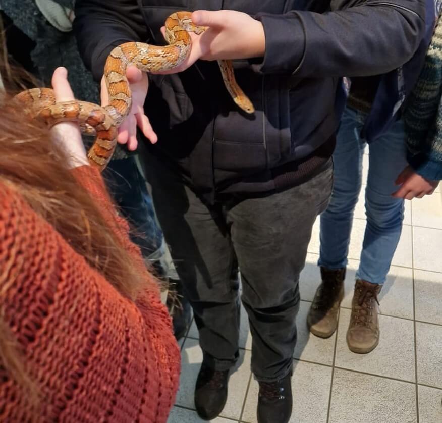 Die Seminare dienen auch organisatorischen Zwecken: Ein Teamer von uns ist Mitglied bei unserem Trägerverein HLNUG und wir besprechen mit ihm typische FÖJ-Dinge: Der Abschlussbericht, die Fahrtkostenabrechnung für die Seminare, die FÖJ-Messe, Zufriedenheit/Probleme mit den Einsatzstellen usw. Wer sich für ein FÖJ interessiert kommt hier zur Internetseite. Auch sollen wir während der Seminare andere Einsatzstellen kennenlernen und so haben wir dieses Mal das StadtWaldHaus in Frankfurt besucht und durften dabei Kauz, Milan, Schleiereule, Wildschwein, Rotwild und Co. aus nächster Nähe sehen und sogar Stabschrecke, Scharbe und Schlange auf die Hand nehmen! Und so schnell werden aus einem Haufen junger Erwachsener wieder Kinder…